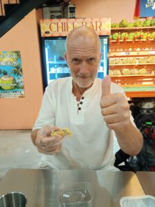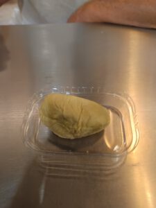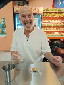 Der ein oder andere weiß, dass in Asien die Stinkfrucht Durian sehr beliebt ist. Rudi gehört definitiv zu den Fans – ich eher nicht. Den Geschmack zu beschreiben ist schwierig. Rudis Einschätzung: puddingähnliche Konsistenz, geschmacklich kaum in Worte zu fassen. Entweder man liebt sie oder man hasst sie. Vielen ist die sogenannte Stinkfrucht vielleicht aus den Essensprüfungen im Dschungelcamp bekannt. Rudi hat seine persönliche Dschungelprüfung jedenfalls erfolgreich absolviert – alle Sterne für ihn.