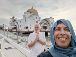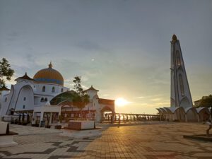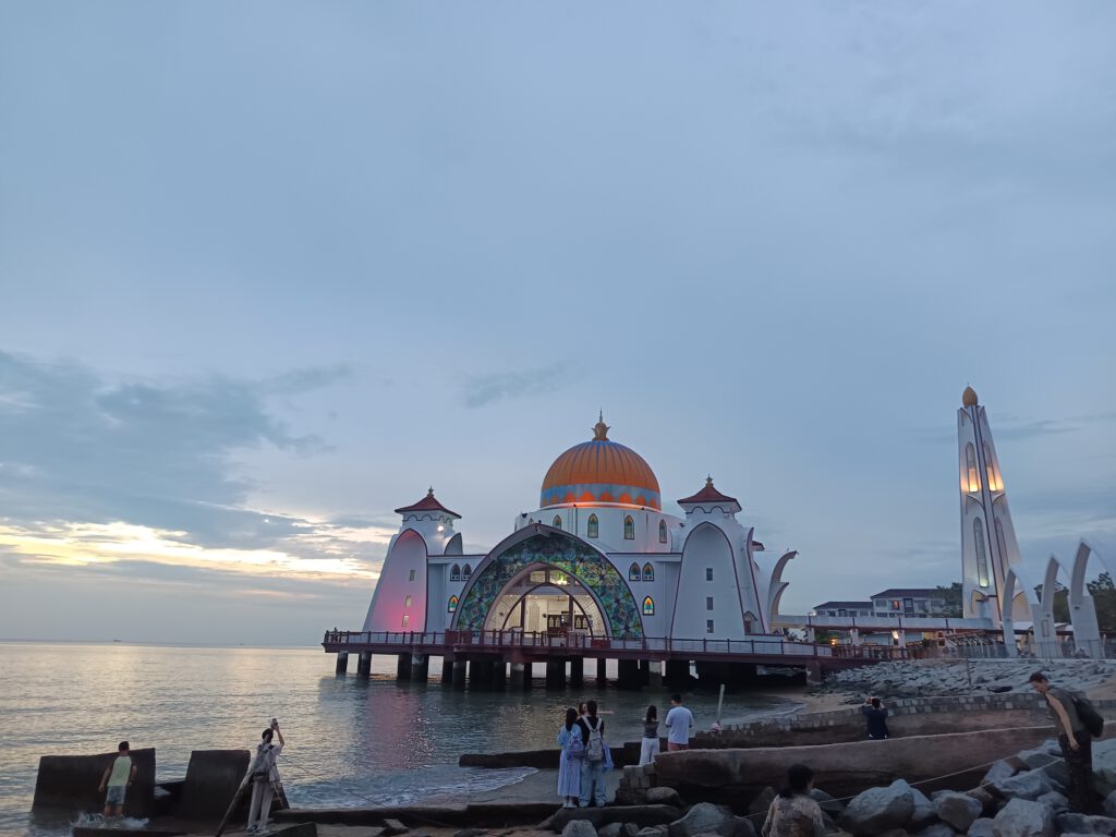 Eigentlich dachten wir, dass wir euch – für’s Erste – mit weiteren Sonnenuntergangsbildern verschonen. Doch an der Straße von Malakka steht eine Moschee auf Stelzen, die – je nach Gezeiten – wirkt, als würde sie auf dem Wasser schweben. Bei Sonnenuntergang konnten wir dann doch nicht widerstehen.