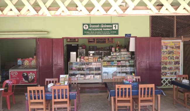 Laos löst manche Dinge sehr pragmatisch. Ein kurzes Magengrummeln führte uns in eine Apotheke, die praktischerweise gleich mit einem Restaurant kombiniert war. Und falls das noch nicht geholfen hätte, wartete daneben eine Eisdiele mit gefüllten Kühltruhen. Drei Lösungen, ein Ort.